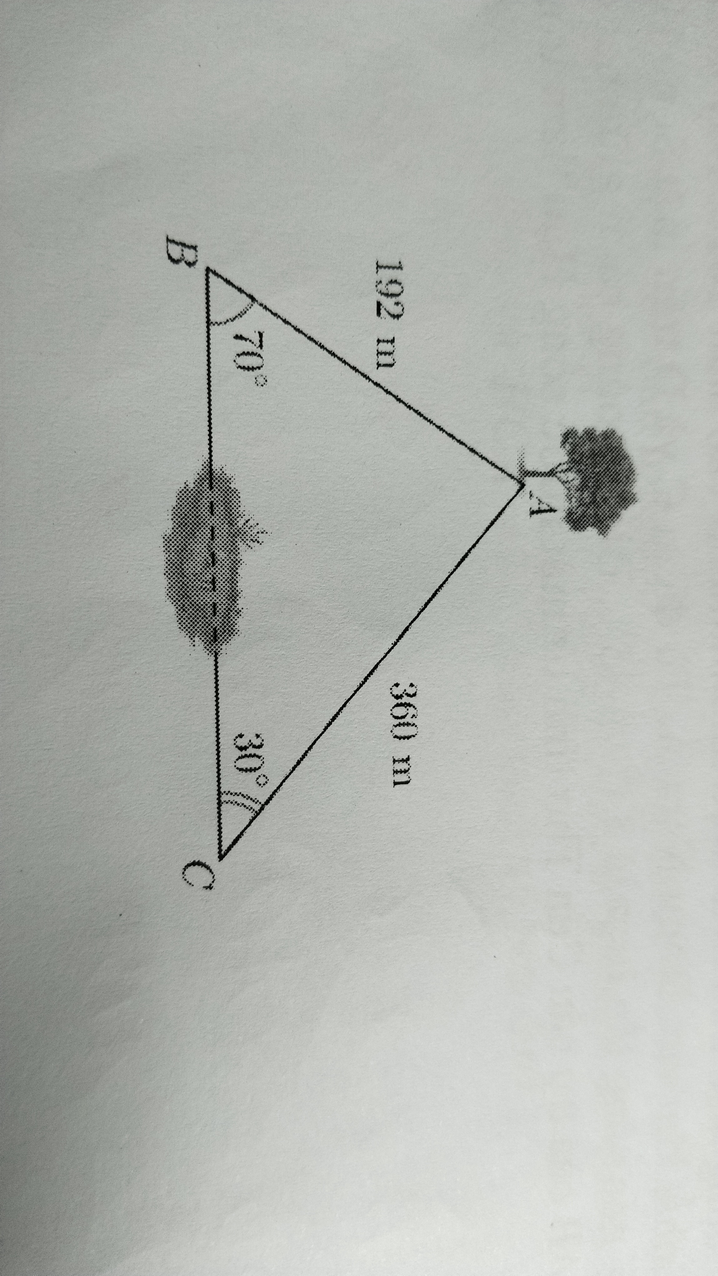 Anh An và anh Bình đứng ở hai bên của một hồ nước cùng nhìn lấy một cái cây cách anh An 192m và cách anh Bình 360 m.biết góc nhìn của anh An và anh Bình đến cây đó lần lượt là 70° và 30°. hỏi anh An đứng cách anh Bình bao nhiêu mét (kết quả làm tròn đến chữ số hàng đơn vị)