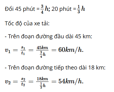 Một xe tải chạy trên quãng đường đầu dài 45 km đi trong 45 phút sau đó xe tải Tiếp tục chạy Thêm 18 km đi trong 20 phút. Tính tốc độ xe tải trên một đoạn đường