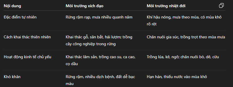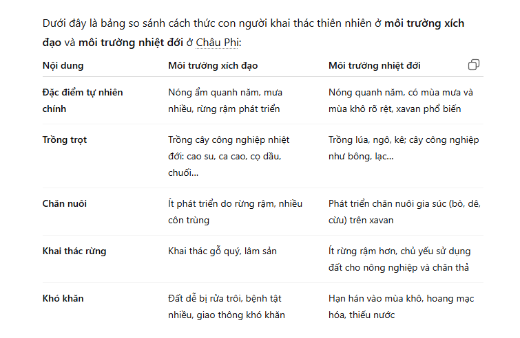 Lập bảng so sánh cách thức con người khai thái thiên nhiên ở môi trường xich đạo và môi trường Nhiệt Đới ở Châu Phi