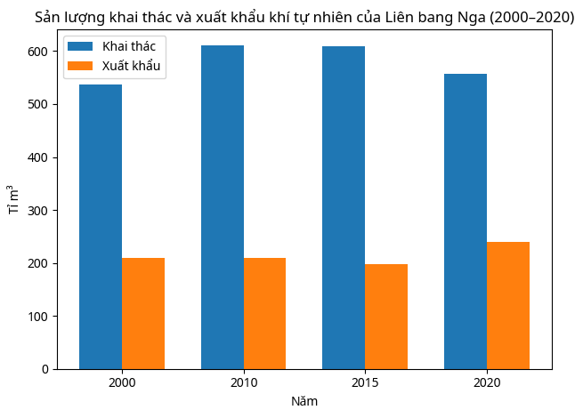 Khai thác luôn lớn hơn nhiều so với xuất khẩu, chứng tỏ Nga còn dùng khí tự nhiên cho tiêu dùng trong nước và công nghiệp.