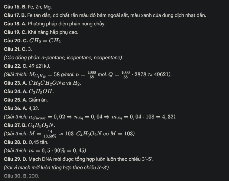 Câu 16: B. Fe, Zn, Mg (Đây là các kim loại đứng trước Hydrogen trong dãy hoạt động hóa học).