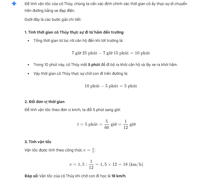 Lúc 7 giờ 15 phút, cô Thủy rời căn hộ chung cư xuống hầm lấy xe đạp điện chở con đi học. Cô ấy đưa con đến trường lúc 7 giờ 25 phút. Biết quãng đường từ lối ra của hầm gửi xe đến trường dài 1,5km và thời gian cô Thủy đi bộ ra khỏi căn hộ chung cư, lấy được xe và ra khỏi hầm là 5 phút. Tính vận tốc của cô Thủy khi chở con đi học.