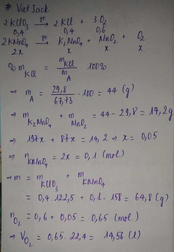 Nung nóng hoàn toàn m gam kali clorat và kali pemanganat thu được V lít khí (đktc) và hỗn hớp chất rắn A trong đó khối lượng kali clorua bằng 29,8 chiếm 67,73% . Viết các PTHH, tính m và V ?