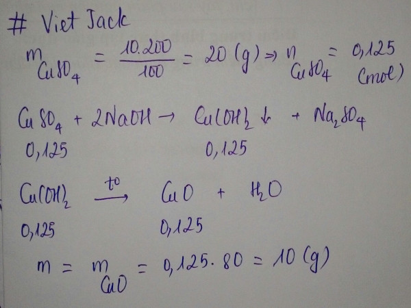 Rót 200 gam dung dịch CuSO4 10% vào cốc đựng dung dịch NaOH dư đến khi phản ứng hoàn toàn. Lọc kết tủa thu được và nung trong không khí đến khối lượng không đổi thì thu được m gam chất rắn. Tính m.