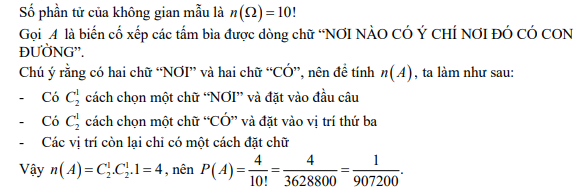 Có 10 tấm bìa ghi chữ “NƠI”, “NÀO”, “CÓ”, “Ý”, “CHÍ”, “NƠI”, “ĐÓ”, “CÓ”, “CON”, “ĐƯỜNG”. Một người phụ nữ xếp ngẫu nhiên 10 tấm bìa cạnh nhau. Tính xác suất để xếp các tấm bìa được dòng chữ “ NƠI NÀO CÓ Ý CHÍ NƠI ĐÓ CÓ CON ĐƯỜNG”.