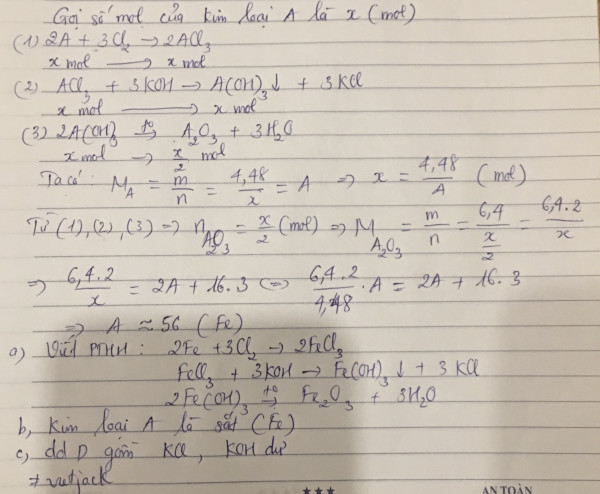 Đốt cháy hoàn toàn 4,48g kim loại A có hoá trị III trong bình khí Clo vừa đủ,thu được một chất rắn.Hoà tận chất rắn vào nước ta đuợc đung dịch B. Cho dd phản ứng với dd KOH dư thu được kết tủa C và dung dịch D.Lọc kết tủa nung ở nhiệt độ đến khối lượng không đối thủ được chất rắn E có khối lượng 6,4g.