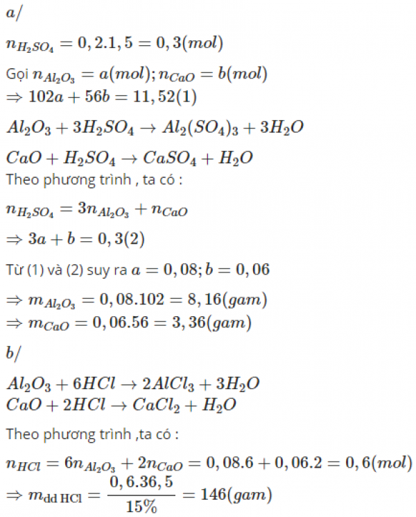 Hoà tan 11,52g hỗn hợp gồm Al2O3; CaO cần 200ml dung dịch H2SO4 1,5M. A, Viết các phương trình phản ứng. B, Tính phần trăm khối lượng của mỗi oxit trong hỗn hợp