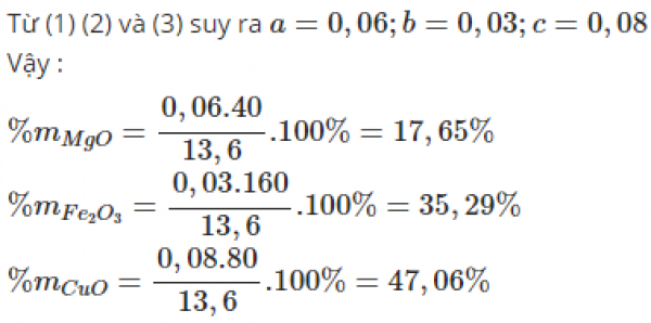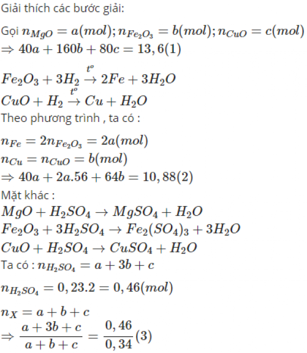 hỗn hợp X gồm MgO,,CuO. dẫn khí H2 dư đi qua ống sứ đựng 13,6 gam hỗn hợp X nung nóng để phản ứng xảy ra hoàn toàn , sau phản ứng khối lượng chất rắn còn lại trong ống sứ la 10,88 gam.Mặt khác để hòa tan hoàn toàn 0,34 mol hỗn hợp X cần dùng 230ml dung dịch 2M .Tính % khối lượng của mỗi chất trong hỗn hợp X