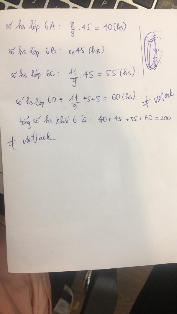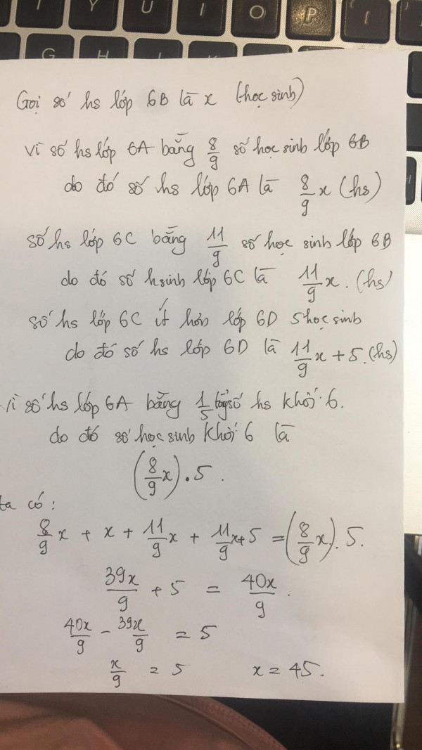 Khối 6 của một trường có 4 lớp A, B, C, D. Số học sinh của lớp 6A bằng 1/5 tổng số học sinh khối 6 và bằng 8/9 số học sinh lớp 6B, số học sinh lớp 6C bằng 11/9 số học sinh lớp 6B và ít hơn số học sinh lớp 6D là 5 học sinh.Hỏi tổng số học sinh khối 6.Tính số học sinh mỗi lớp