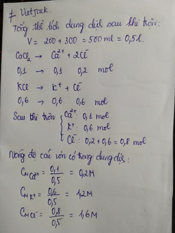 Trộn 200 ml dung dịch 0,5M và 300 ml KCl 2M. Tính nồng độ mol/l của các ion có trong dung dịch.