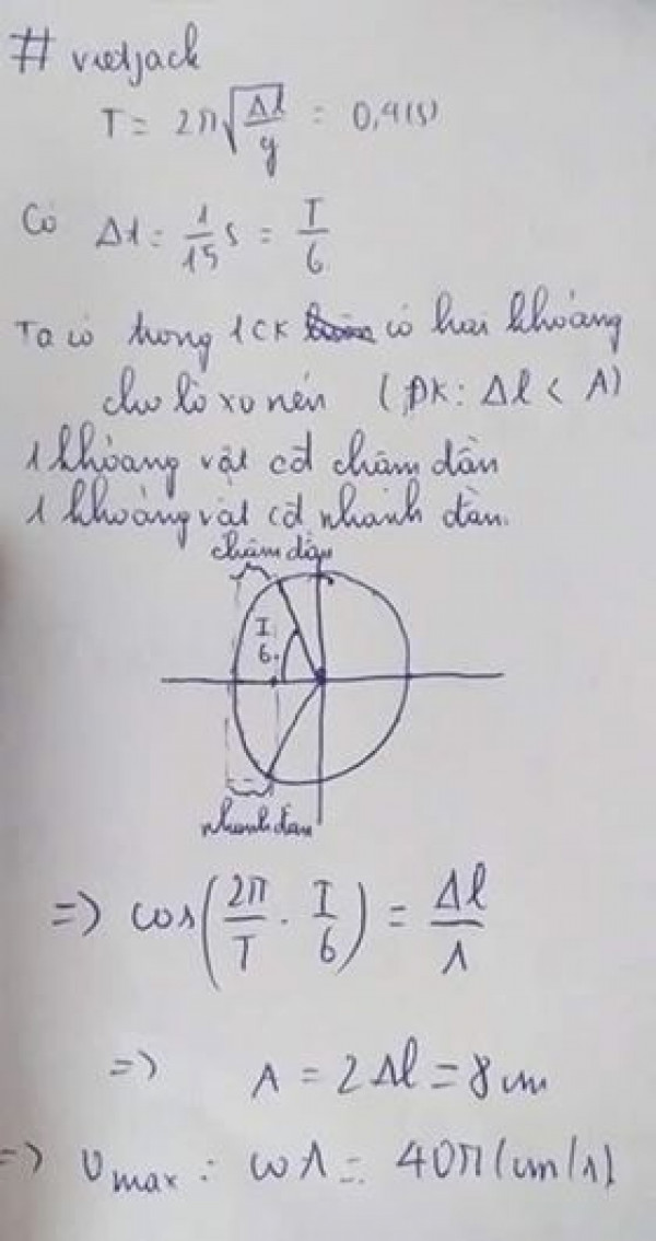 một con lắc lò xo treo thẳng đứng đang dao động điều hòa tự do ở vtcb lò xo giãn 4 cm biết trong một chu kì khoảng thời gian lò xo bị nén và vật chuyển động nhanh dần bẳng 1/15 s lấy g=pi bình=10 m/s bình tốc độ cực đại của vật là