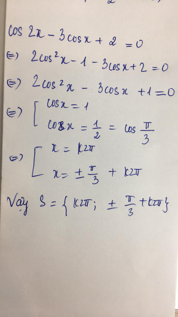 Phương trình sau cos2x-3 cosx +2=0 có nghệm là: