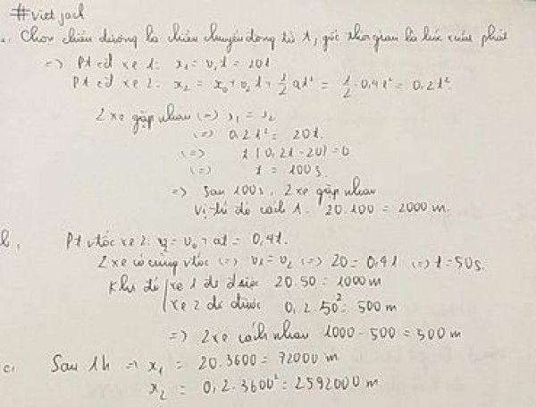 Hai vật cùng xuất phát một lúc tại A, cđ cùng chiều. Vật thứ nhất cđ đều với vận tốc v1=20m/s, vật thứ hai cđ thẳng nhanh dần đều với vận tốc ban đầu không và gia tốc 0,4m/s. Chọn chiều dương là chiều cđ, gốc tọa độ O tại A, gốc thời gian là lúc xuất phát