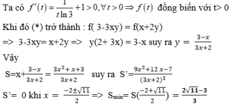 Xét các số thực dương thỏa mãn . Tìm giá trị nhỏ nhất Smin của S = x + y