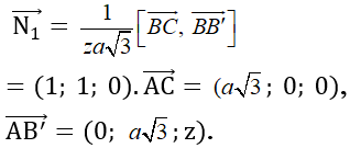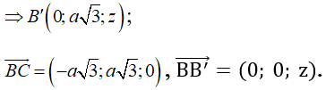 Chọn hệ trục tọa độ Oxyz sao cho A (0;0;0), B (0; a√3; 0), C (a√3;0;0), A' (0;0;z) (z > 0).