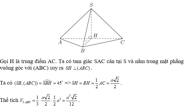 Cho hình chóp S.ABC có đáy là tam giác ABC vuông cân tại B, AB = a, tam giác SAC cân tại S và nằm trong mặt phẳng vuông góc với đáy. Tính thể tích khối chóp S.ABC biết góc giữa SB và mặt phẳng (ABC) bằng 450