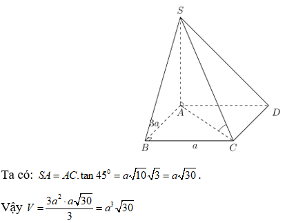 Cho khối chóp S.ABCD có đáy là hình chữ nhật cạnh AB=3a, BC=a. Cạnh bên SA vuông góc với đáy; SC tạo với mặt phẳng (ABCD) một góc 600. Tính thể tích V của khối chóp đã cho