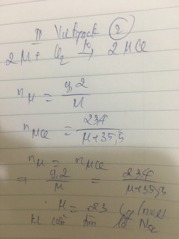Bài 2 : cho 9,2 gam một kim loại hóa trị I tác dụng vừa đủ với Cl2 thu được 23,4 gam muối clorua . Xác định tên kim loại.