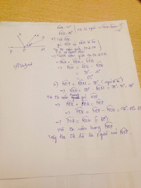 Vẽ góc MON kề bù với góc NOP sao cho MON bằng 50 độ, vẽ tia OQ là tia phân giác của NOM vẽ tia OK nằm trong góc PON sao cho góc KOQ bằng 90 độ. Tính góc NOK, tia OK có là tia phân giác của PON ko vì sao