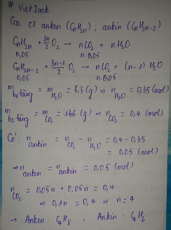 Hỗn hợp khí X gồm anken A và ankin B có cùng số nguyên tử C trong phân tử và có số mol bằng nhau. Đốt cháy hoàn toàn hỗn hợp X, sản phẩm cháy cho qua bình 1 đựng H2SO4 đặc, bình 2 đựng Ca(OH2 dư thấy khối lượng bình 1 tăng 6,3g, bình 2 tăng 17,6 g. Xác định CTPT của 2 HC trong hỗn hợp X.