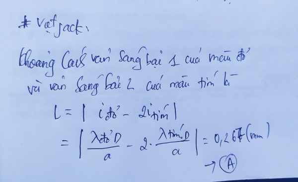 Trong thí nghiệm y âng, các khe được chiếu sáng bằng ánh sáng trắng. Nếu a=0,3mm D=2m và bước sóng đỏ bằng 0,76. Bước sóng tím = 0,40. Thì khoảng cách vân sáng bậc 1 của màu đỏ và vân sáng bậc 2 của màu tím là bao nhiêu?