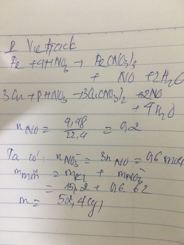 Cho 15.2 g Fe,Cu tác dụng vs lượng dư dd nhỏ loãng sih ra 4.48 l NO(dkc, sp khử duy nhất) cô cạn dd dc m gam muối khan. Giá trị m là