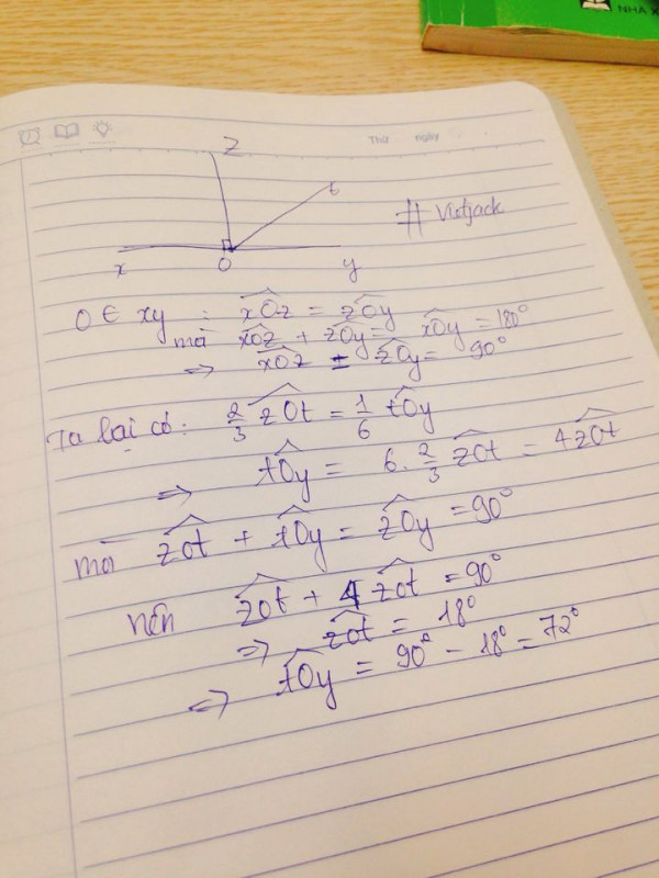 Cho O là một điểm thuộc đường thẳng xy, vẽ tia Oz sao cho nó chia xOy thành hai góc bằng nhau. Vẽ tia Ot nằm giữa 2 tia Oz và Oy, chia zOy thành 2 góc zOt và tOy. Biết zOt=tOy Tính số đo zOt và xOy