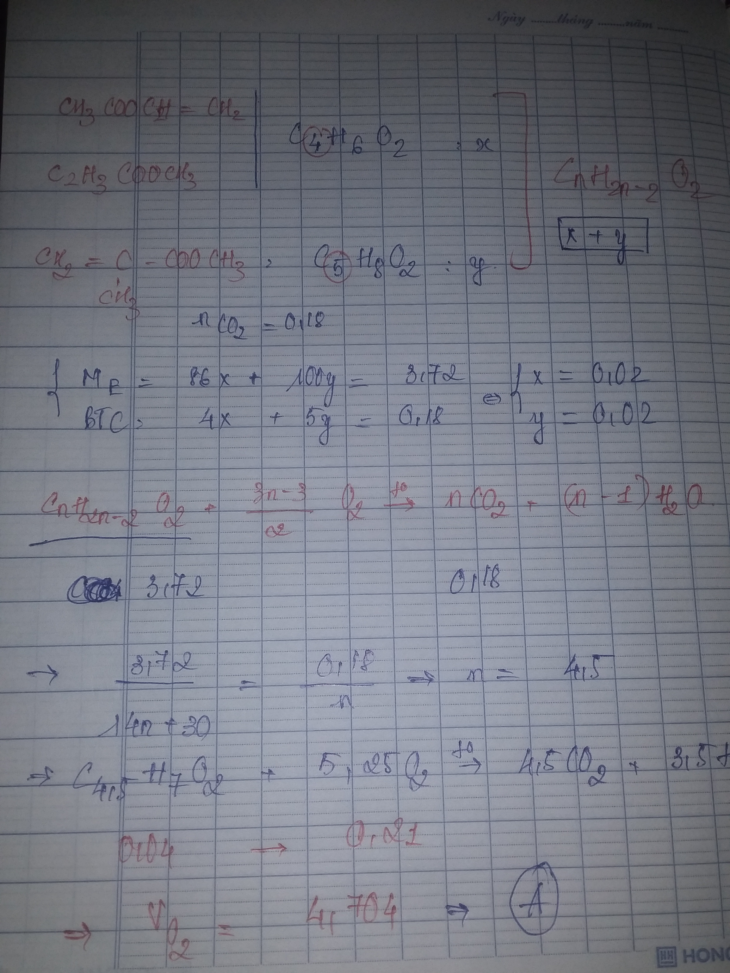 Hỗn hợp E gồm vinyl axetat, metyl acrylat và metyl metacrylat. Đốt cháy hoàn toàn 3,72 gam E cần vừa đủ V lít khí O2 (đktc), thu được H2O và 7,92 gam CO2. Giá trị của a là