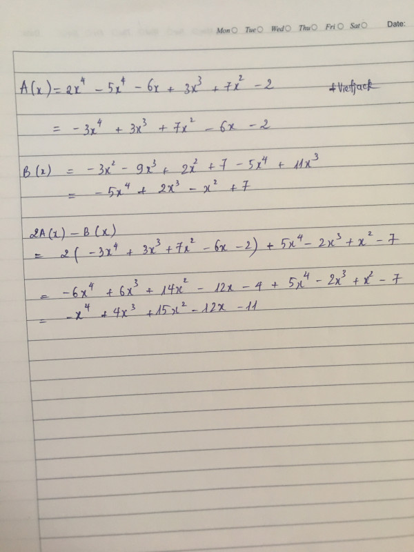 Bài 3 : Cho các đa thức: A(x) = 2x^4 – 5x^4 – 6x + 3x^3 + 7x^2 – 2 và B(x) = - 3x^2 – 9x^3 + 2x^2 + 7 – 5x^4 + 11x^3 a) Thu gọn và sắp xếp các đa thức theo lũy thừa giảm của biến b) Tính 2A(x) – B(x)