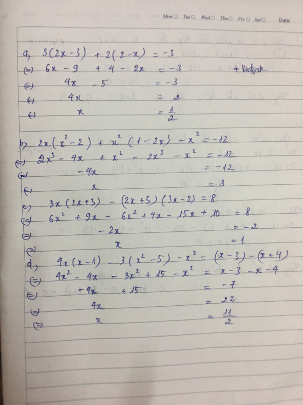 c) 3x(2x+3)-(2x+5)(3x-2)=8