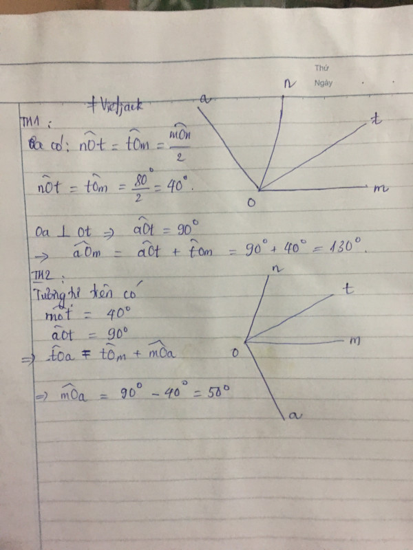 cho góc mOn = 80 độ; Ot là tia phân giác của góc mOn. vẽ tia sao cho Oa vuông góc Ot. Tính mOa?