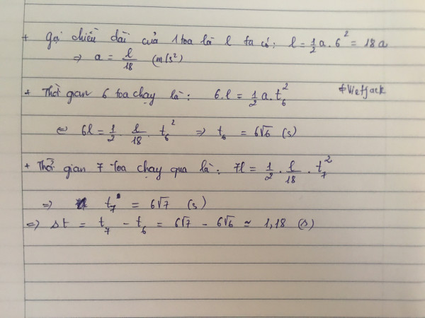 Một người đứng ở sân ga nhìn đoàn tàu chuyển bánh nhanh dần đều. Toa thứ nhất đi qua trước mặt người ấy trong thời gian 6s. Hỏi toa thứ 7 đi qua trước mặt người ấy trong bao lâu