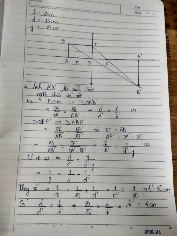 Vật sáng AB cao 2cm đặt vuông góc với trục của 1 thấu hội tụ, A nằm trên trục chính, AB cách thấu kính 15cm, thấu kính có tiêu cự 10cm.