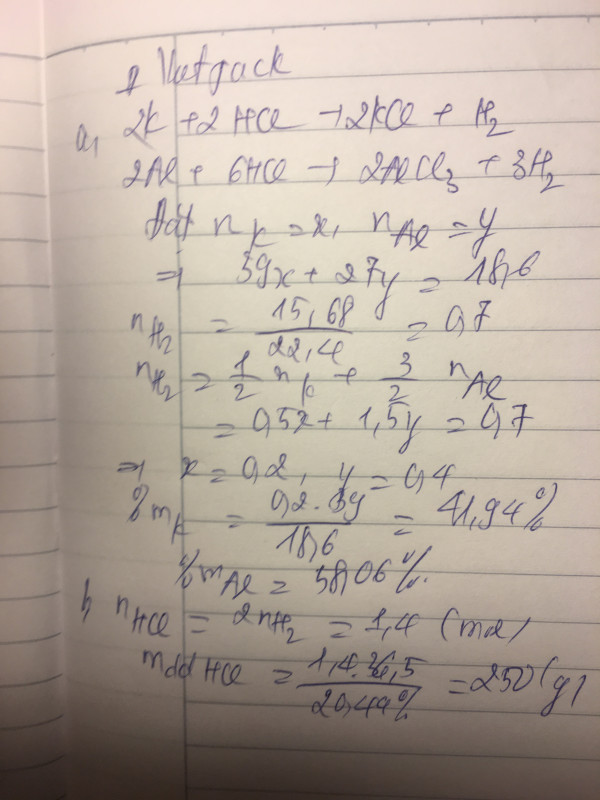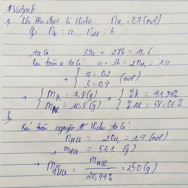 Hoàn tan hoàn toàn 18,6g hỗn hợp A gồm K và Al trong dd HCl 20,44%. Sau phản ứng thu được 15,68 lít khí (đktc) và dd B