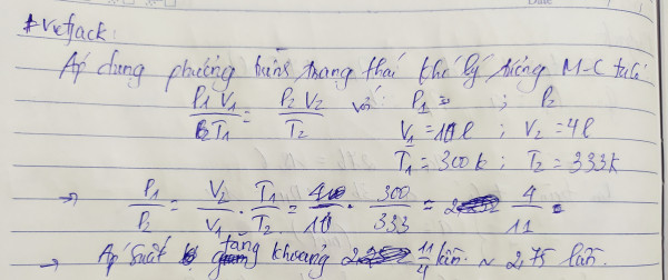 Nén 10lít khí ở nhiệt độ 27độ C để cho thể tích của nó chỉ còn 4 lít và nhiệt độ là 60độ C Hỏi áp xuất của khí tăng lên báo nhiêu lần