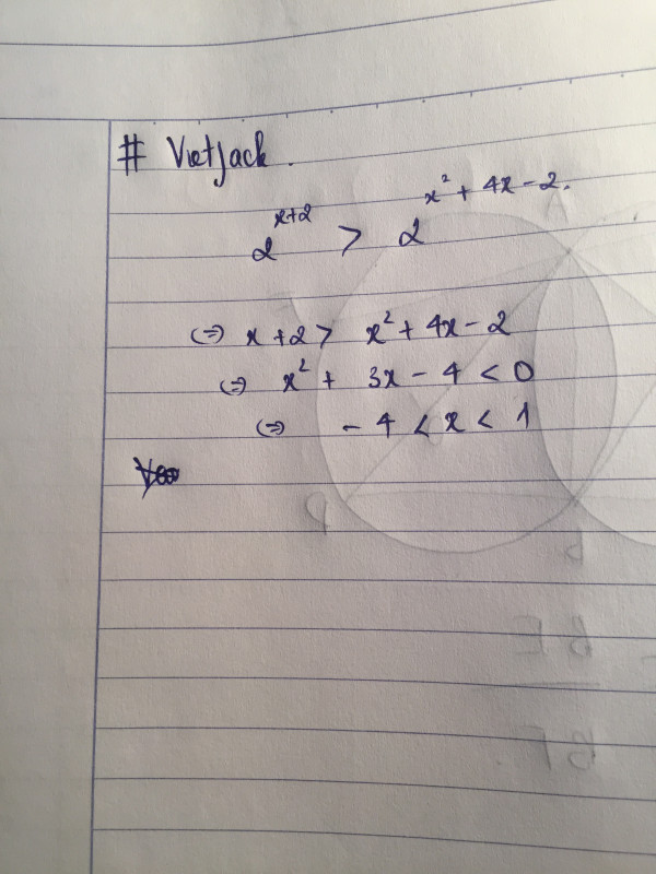 Tập nghiệm của bất phương trình 2^(X+2)>2^(X^2 +4X-2) là