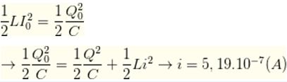 Một mạch dao động LC lí tưởng có L = 40mH, C = 25µF, điện tích cực đại của tụ q0 = 6.10-10C. Khi điện tích của tụ bằng 3.10-10 C thì dòng điện trong mạch có độ lớn.