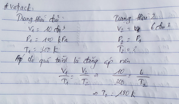Một lượng khí lí tưởng chứa trong một xilanh có pit-tông chuyển động được. Các thông số trạng thái ban đầu của khí là 10 dm3;100 kPa; 300 K. Khí được làm lạnh theo một quá trình đẵng áp tới khi thể tích còn 6 dm3. Xác định nhiệt độ cuối cùng của khí.
