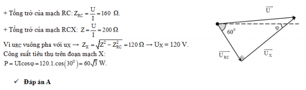 Đoạn mạch AM gồm điện trở thuần R và tụ điện mắc vào điện áp xoay chiều V thì cường độ dòng điện hiệu dụng qua AM là 1,25 A và dòng điện này lệch pha π/3 so với điện áp trên mạch AM. Mắc nối tiếp mạch AM với đoạn mạch X để tạo thành đoạn mạch AB rồi lại đặt vào hai đầu đoạn mạch điện áp u nói trên thì cường độ dòng điện hiệu dụng qua mạch là 1 A và điện áp hai đầu AM vuông pha với điện áp hai đầu X. Công suất tiêu thụ trên đoạn mạch X là: