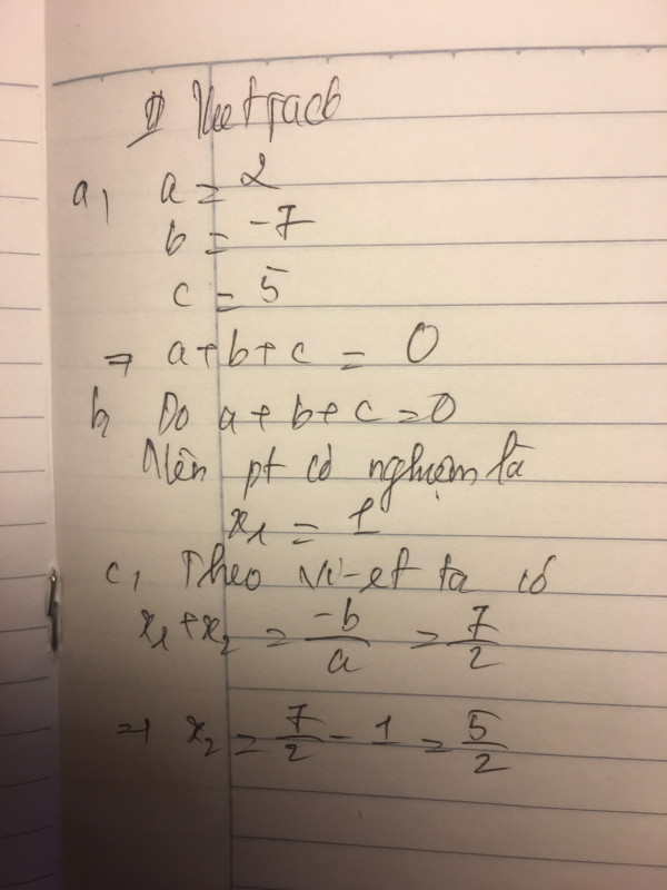 Cho phương trình 2x ^ – 7x + 5 = 0 . a ) Xác định các hệ số a , b , c rồi tinh a + b + c . b ) Chứng tỏ rằng x1 = 1 là một nghiệm của phương trình . c ) Dùng định lý Vi - ét để