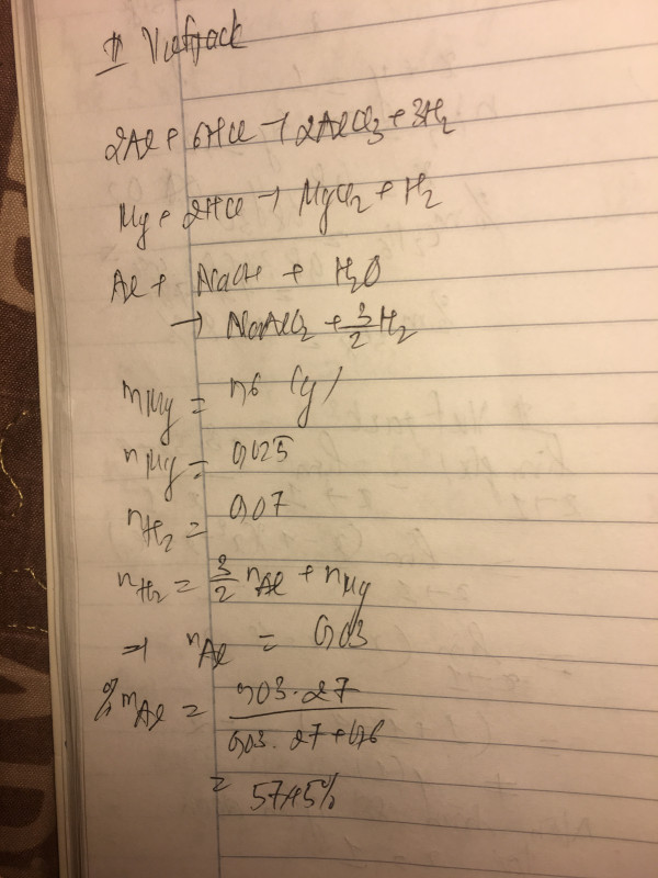 Hòa tan a gam hỗn hợp Al và Mg trong dd HCl loãng dư thu được 1,568 lít khí đktc nếu cũng cho a gam hỗn hợp trên tác dụng với dd NaOH dư thì sau pứ còn lại 0,6 g rắn thành phần % khoi lượng của Al trong hỗn hợp là