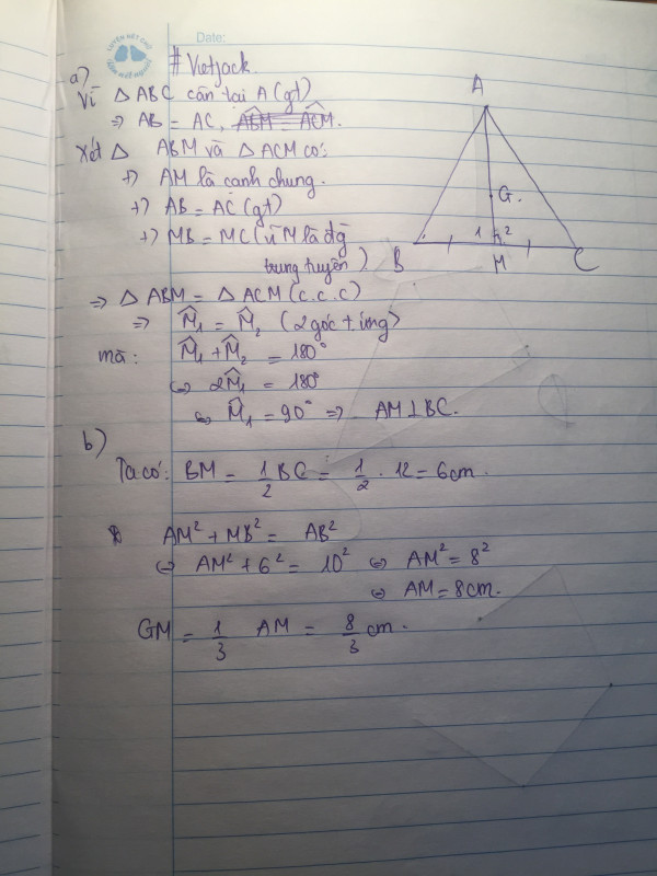 b) Biết AB=10cm, BC= 12cm, đường trung tuyến BM, trọng tâm G. Tính độ dài GM