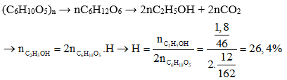 Tại một nhà máy rượu ở Quảng Ngãi, cứ 12 tấn tinh bột sẽ sản xuất được 1,8 tấn etanol. Vậy hiệu suất của quá trình điều chế đó là: