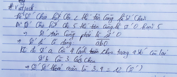 Cho 5 chữ số 9,1,3,5,0. Hỏi lập được bao nhiêu số có 3 chữ số chia hết cho cả 2 và 5.