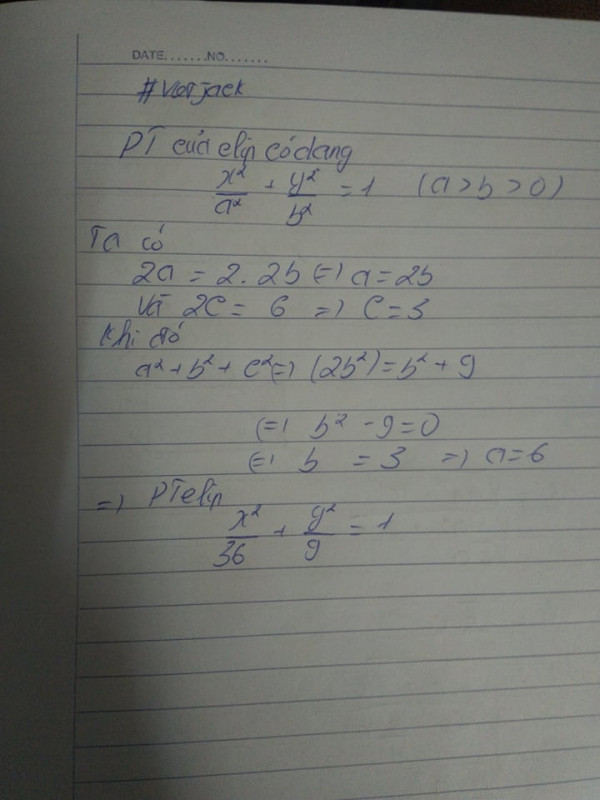 Trong mặt phẳng hệ tọa độ với oxy viết phương trình chính tắc của elip có độ dài gấp đôi trục b và có tiêu cự bằng 6