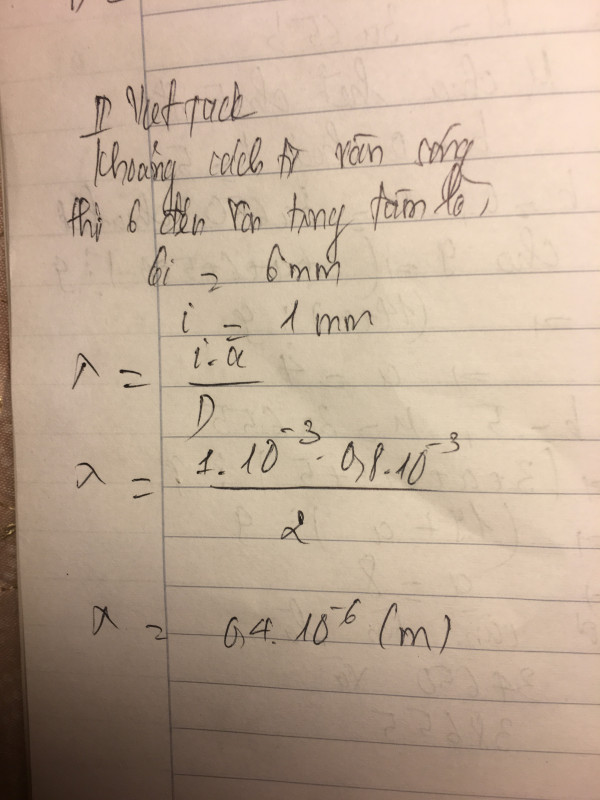 Trong giao thoa ánh sáng với khe I Âng, khoảng cách từ mặt phẳng chứa hai khe đến màn quan sát D=2m và hai khe cách nhau a=0,8mm. Trên màn quan sát người ta đo được vân sáng thứ 6 cách vân sáng trung tâm là 6mm. Tính bước sóng ánh sáng dùng trong thí nghiệm?