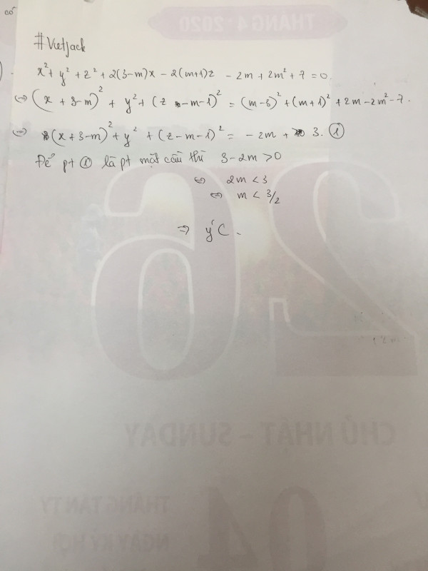x^2 + y^2 + z^2 + 2(3-m)x - 2(m+1)z-2m+2m^2 +7 = 0 là phương trình mặt cầu