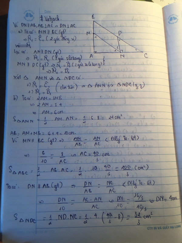 Cho ABC vuông tại A. Trên cạnh AB lấy M sao cho 2AM=3MB. Một đường thẳng qua M song song với BC, cắt AC tại N. Một đường thẳng qua N song song với AB cắt BC tại D. Chứng minh tam giác AMN đồng dạng với tam giác NDC.