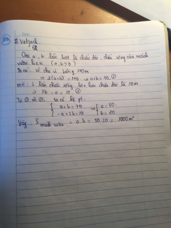 Một khu vườn hình chữ nhật có chu vi bằng 140m và ba lần chiều rộng lớn hơn chiều dài là 10m. Tính diện tích của khu vườn.