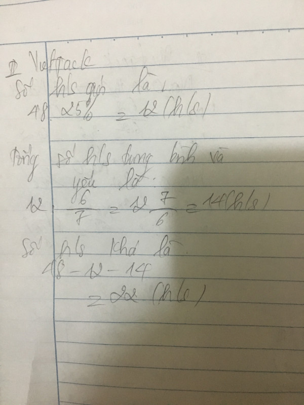 Lớp 6A có 48 học sinh giỏi, khá,trung bình, yếu. Số học sinh giỏi bằng 25% số học sinh cả lớp và bằng tổng số học sinh trung bình và yếu. Tính số học sinh khá